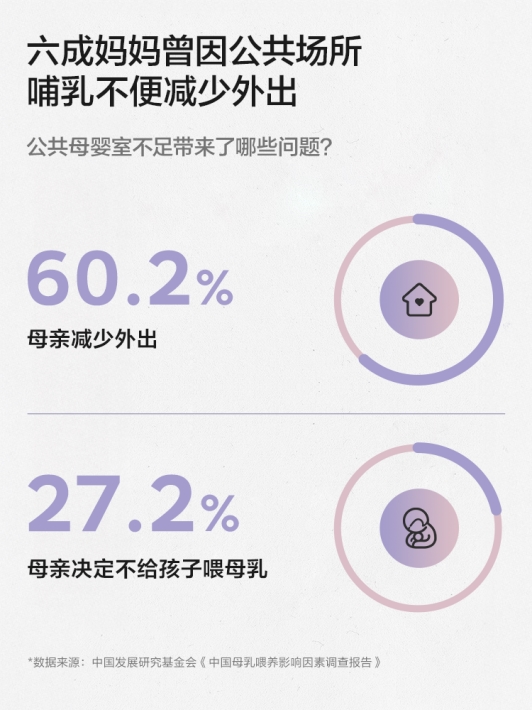 據中國發展研究基金會發布的《中國母乳喂養影響因素調查報告》顯示,60.2%的母親曾因在公眾場所哺乳不便而減少外出。找不到、不夠好的母嬰室,困住了媽媽們。