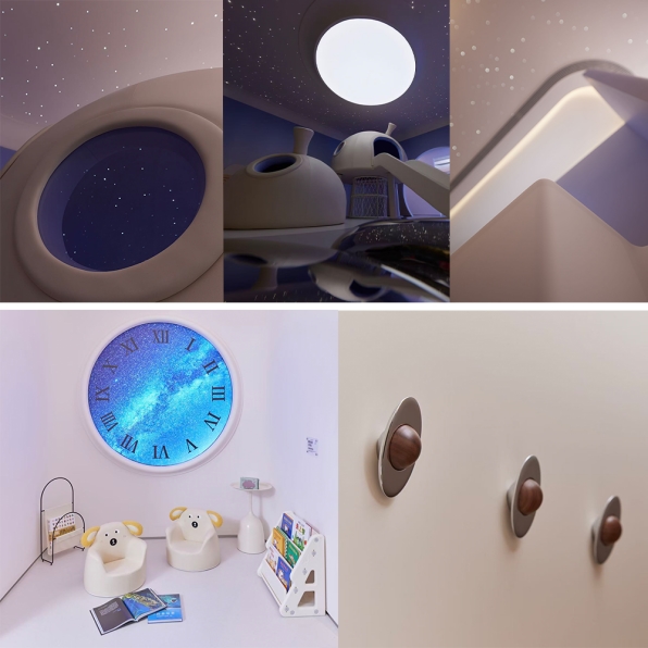 圍繞“太空旅程”主題,母嬰室內,驚喜細節俯拾皆是。從星空頂、“太空舷窗”、還有飛行器造型的兒童滑梯,甚至飛碟形狀的掛衣鉤,這個空間,不止是一個應急之所,更是驚喜的去處。