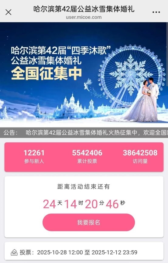 答案或許就藏在這里——近日,哈爾濱第42屆“四季沐歌”公益冰雪集體婚禮全國新人征集儀式啟動的消息剛剛發(fā)出便引發(fā)關(guān)注,僅僅半個多月的時間,報名平臺顯示訪問量超3800萬,成功報名新人數(shù)量突破12000對,微博、抖音、各大平臺的討論熱度居高不下。當別的城市還在等初雪,哈爾濱已經(jīng)用一場“提前開燃”的北國浪漫,把整座城市調(diào)成了甜寵版的“爾濱3.0”。
