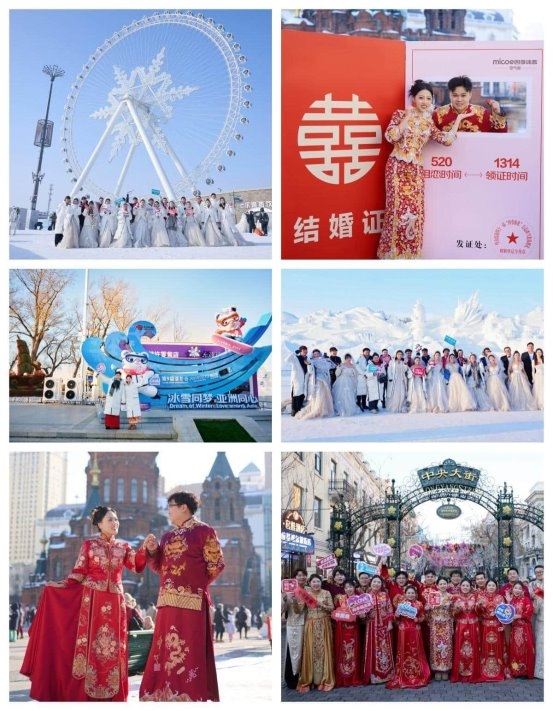 這波寵客并非是一時的噱頭,而是哈爾濱冰雪集體婚禮組委會四十多年來堅守的公益?zhèn)鞒小W鳛橹袊讉€以冰雪為載體的婚禮大典活動,哈爾濱冰雪集體婚禮迄今已成功舉辦41屆,共有來自全球五大洲20多個國家的1320對新婚和紀念婚夫婦,到哈爾濱觀賞冰雪奇觀、體驗冰雪激情。